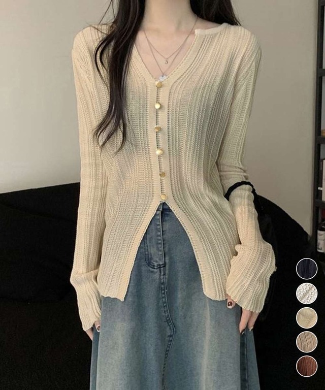 透かし編み Vネック ニット フロントボタン