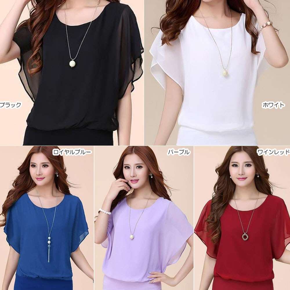 シフォン ブラウス 半袖 レディース ラウンドネック ドルマン スリーブ トップス 無地