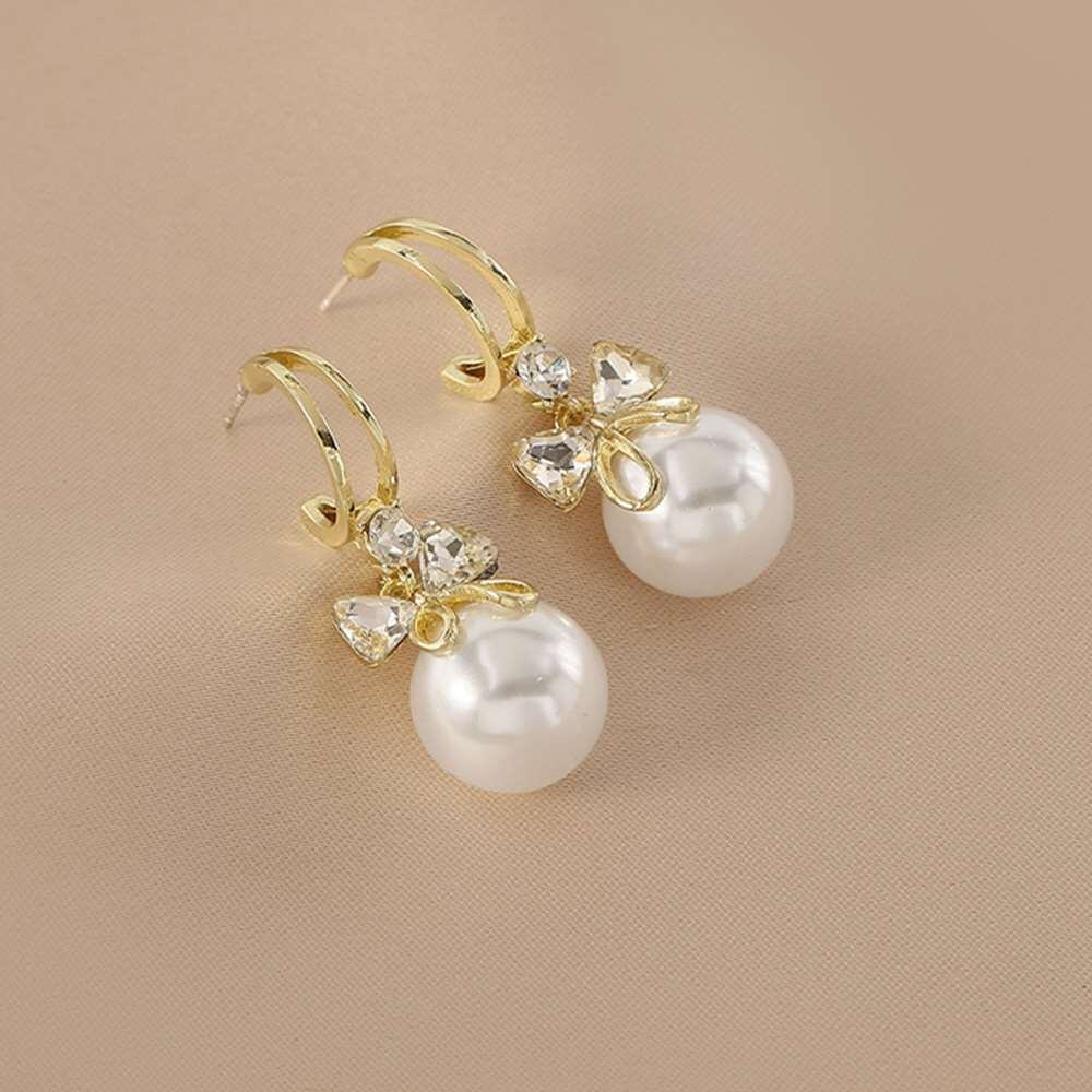 きらきら輝くラインストーンで飾られたリボンモチーフと大ぶりの一粒フェイクパールのデザインピアス