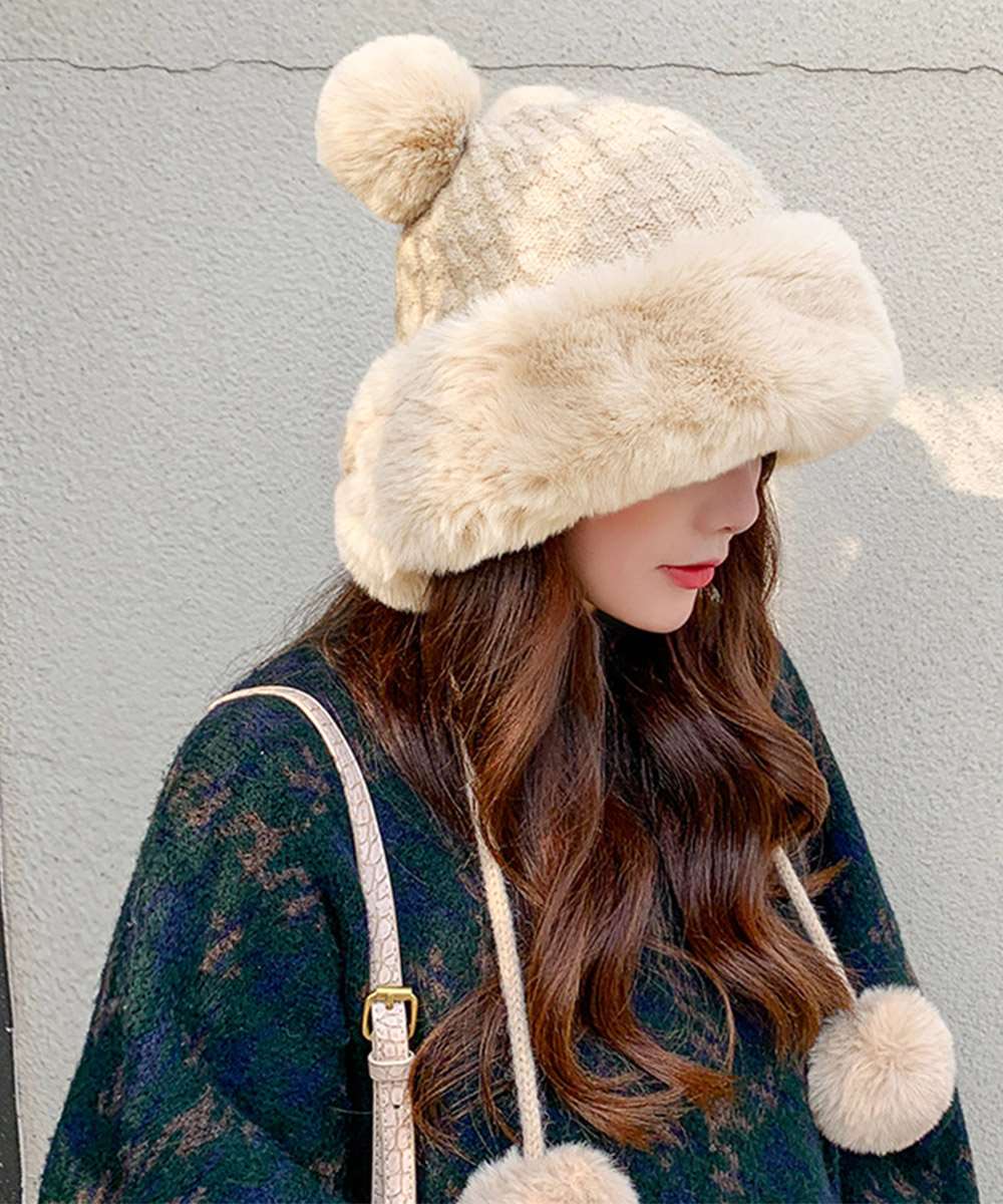 ニット生地にふわふわエコファー、可愛いポンポンが付いたレディース帽子