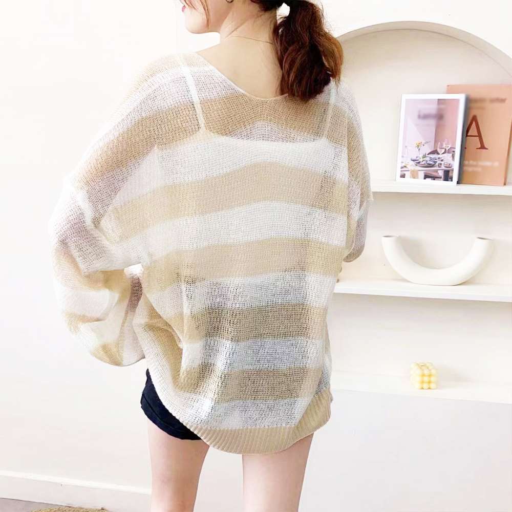 レトロ感が溢れている、おしゃれな透かし編みボーダー柄サマーニットカーディガン