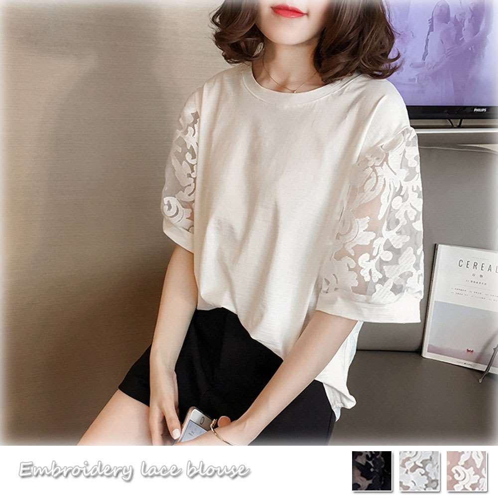 刺しゅうレース切り替えデザインで華やかな雰囲気を与えてくれる刺しゅうチュールカットソー