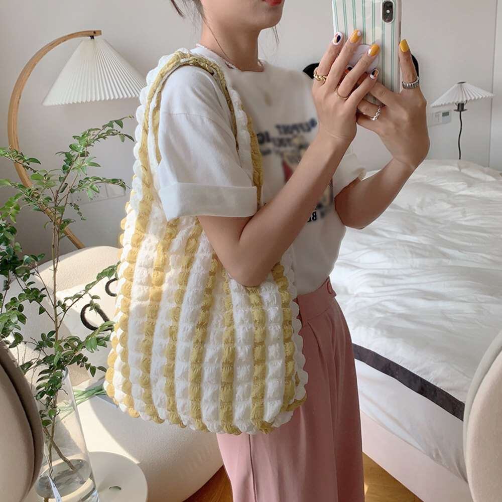 トレンドのポップコーン生地がおしゃれ♪大容量配色ハンドバッグ