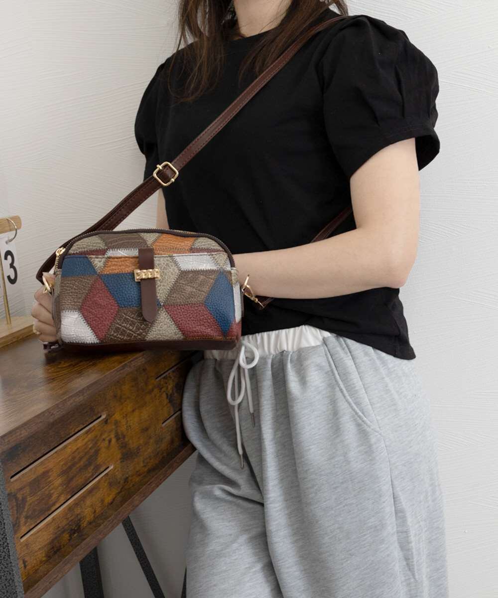 温かみのある色合いとユニークな幾何学模様が特徴のショルダーバッグ