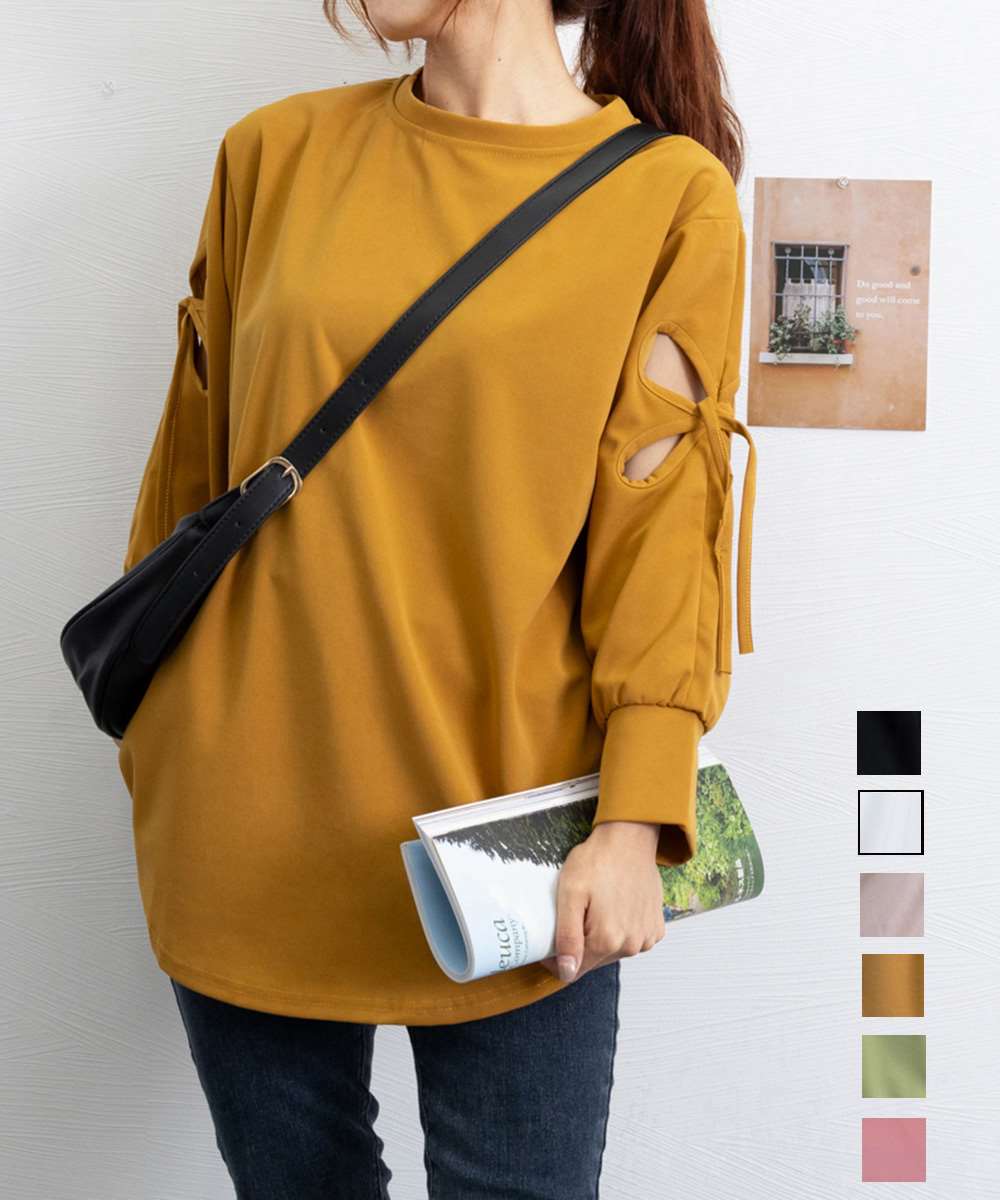 袖のリボンデザインが、さりげなくおしゃれな雰囲気をプラスするTシャツカットソー