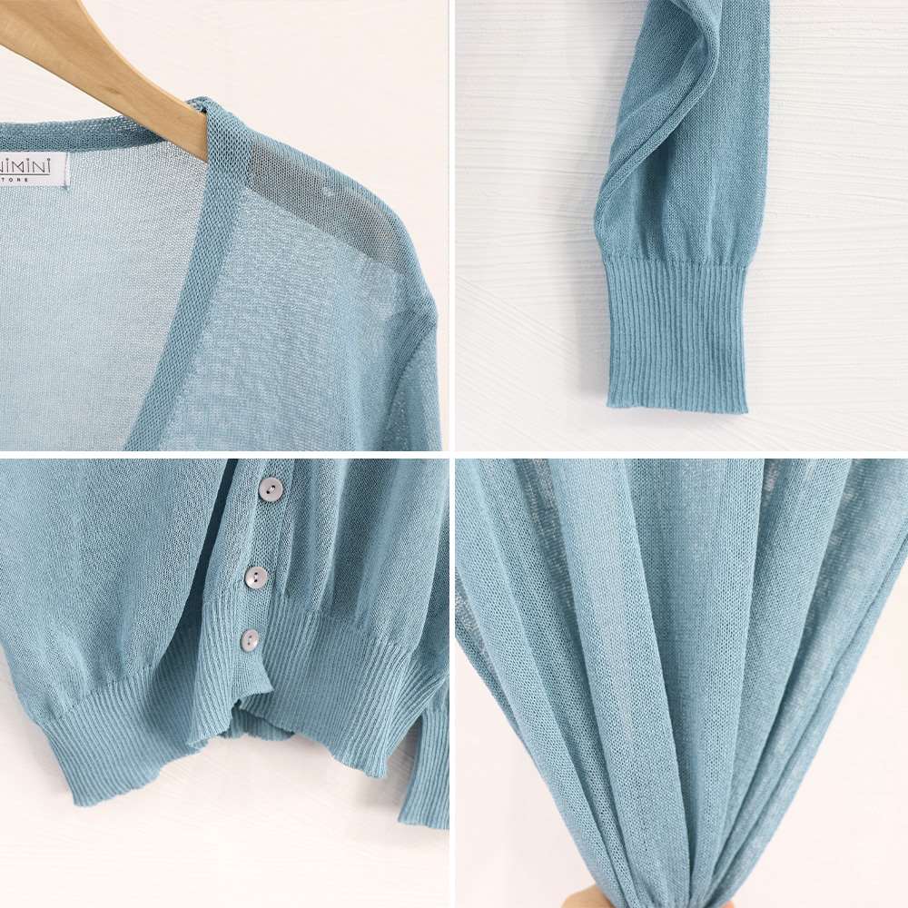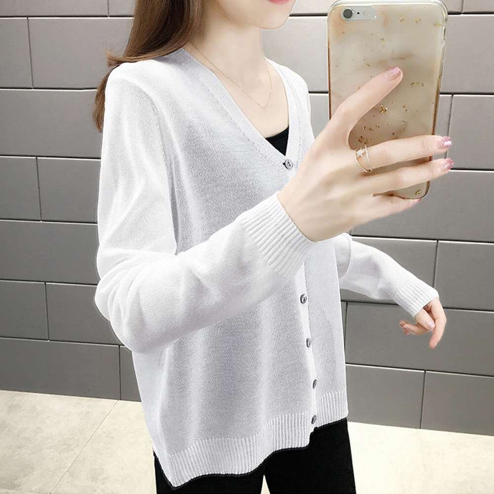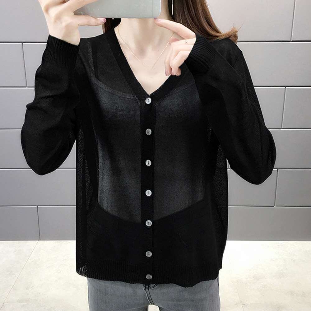 シアー仕様で涼しげ、首元をすっきりと見せて小顔見せもできるVネックシングルブレストカーディガン