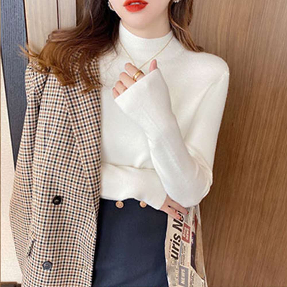 プチハイネックがさりげなく顔まわりにキュートなアクセントをメイク、スマートなルックスに導く、すっきりとした印象のニットトップス