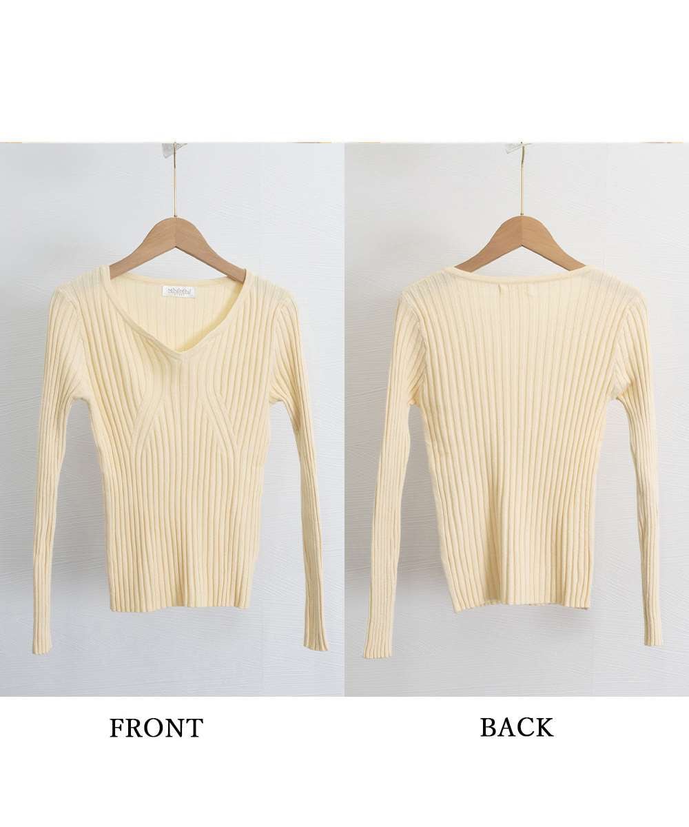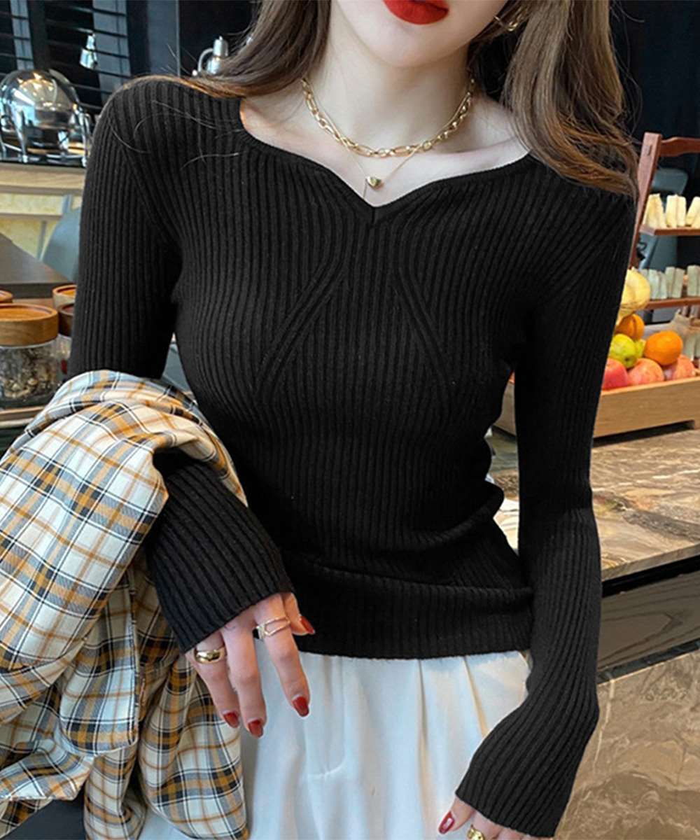 ハートネックで首元がすっきり綺麗に見える長袖タイトニットトップス