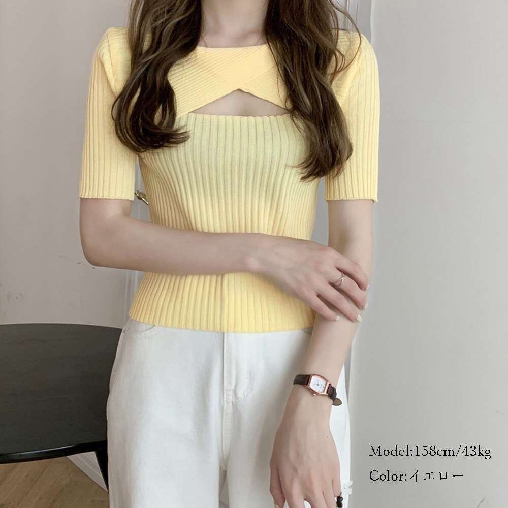 レディース ねじり サマーニット 着やせ ニットソー 薄手 無地 トップス 胸開き 春夏
