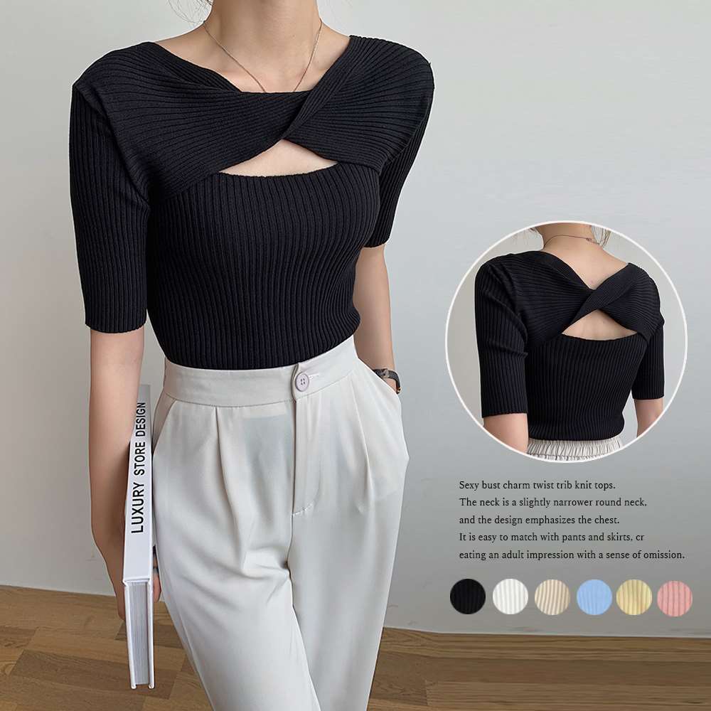 セクシーなバスト魅せツイストリブニットトップス