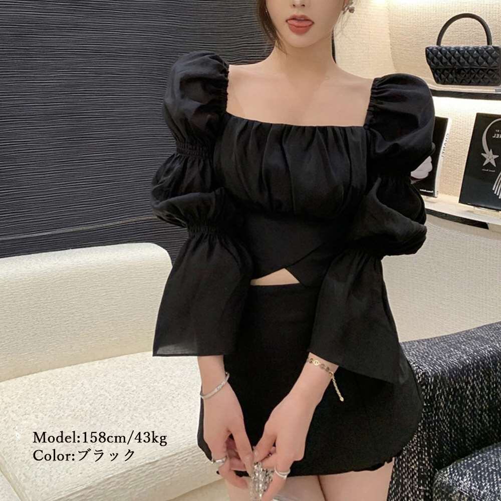 オープンバック仕様にリボン結びデザインがセクシーで可愛いパフスリーブ袖トップス