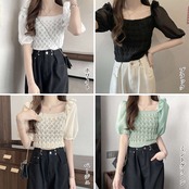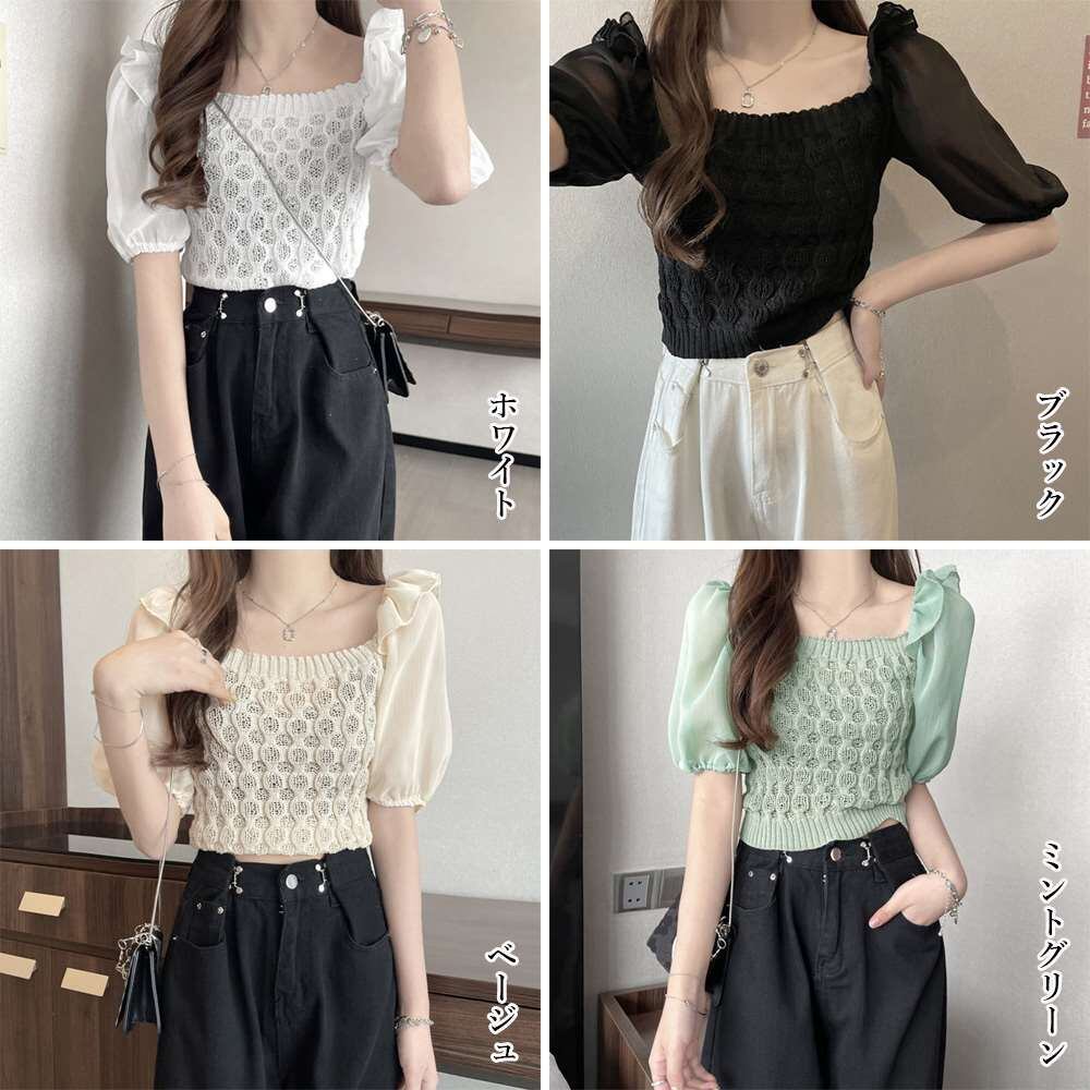 キーワード:着やせサマーニット 半袖 無地トップス 鎖骨見せ シャツ