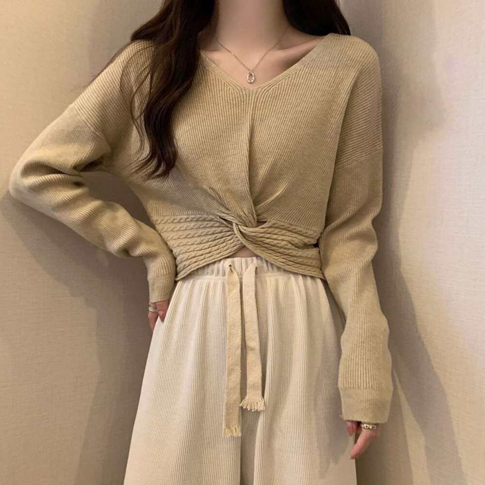 キーワード:ショート丈トップス 着やせ ニットソー 韓国風 リブニット