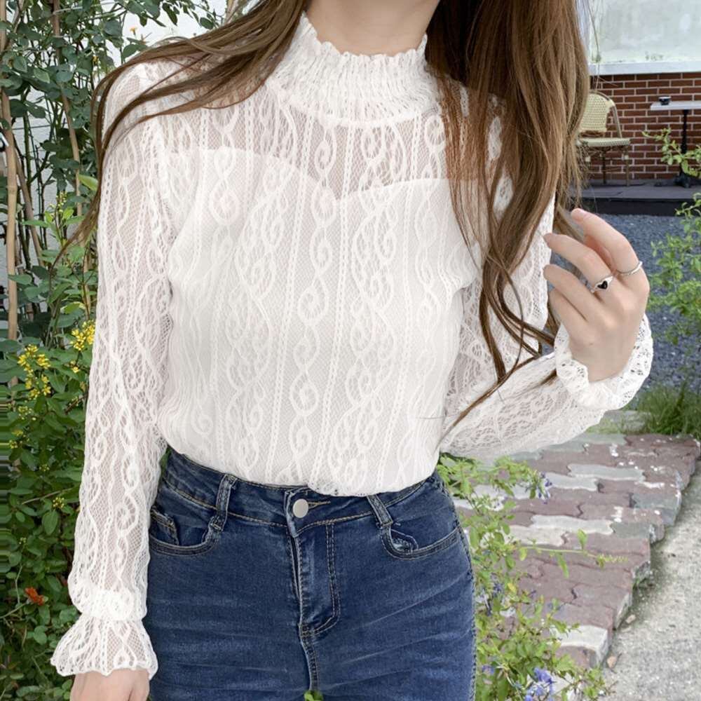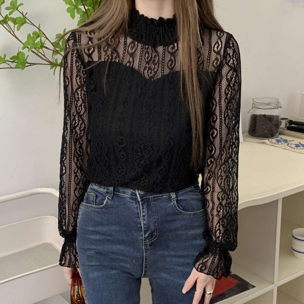 キーワード:長袖 レースシャツ 透け感 ブラウス セクシートップス