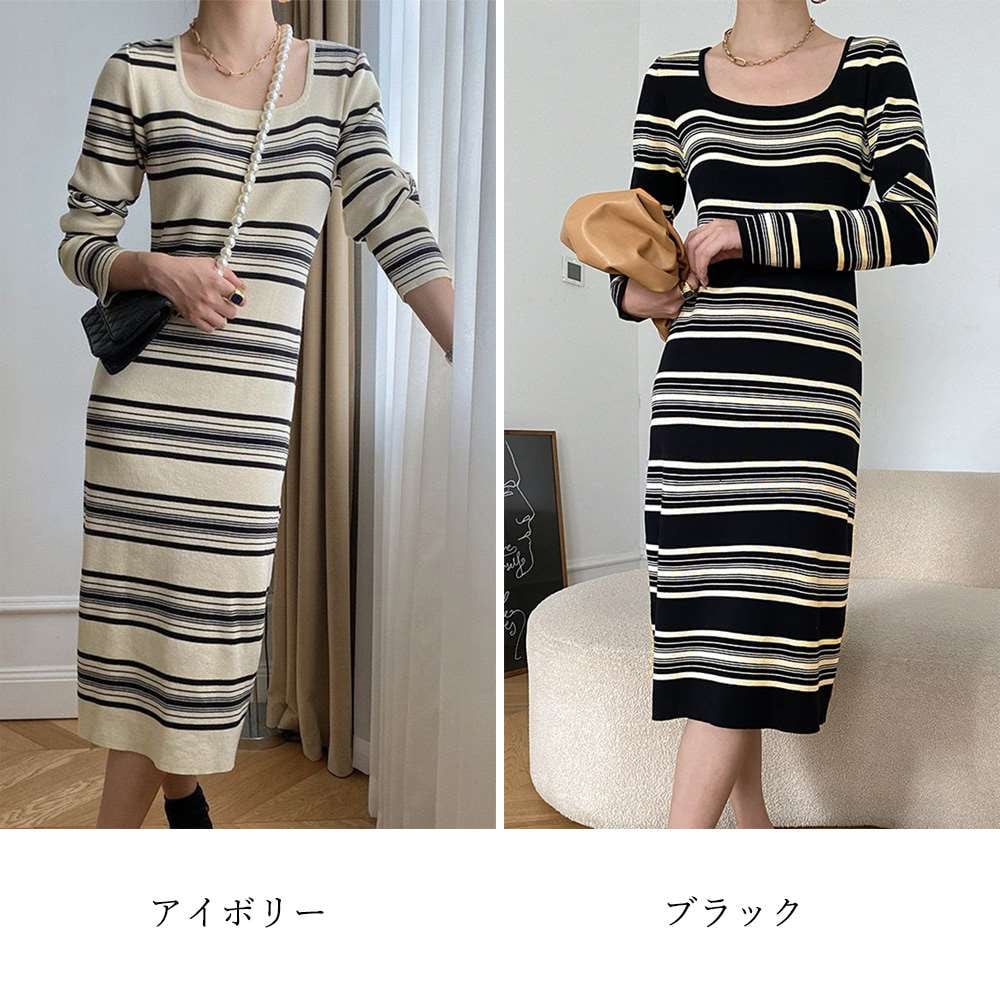 レトロな雰囲気が漂うボーダー柄ロングニットワンピース