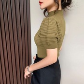 パフスリーブ×ハイネックデザインが上品な印象の半袖サマーニットトップス