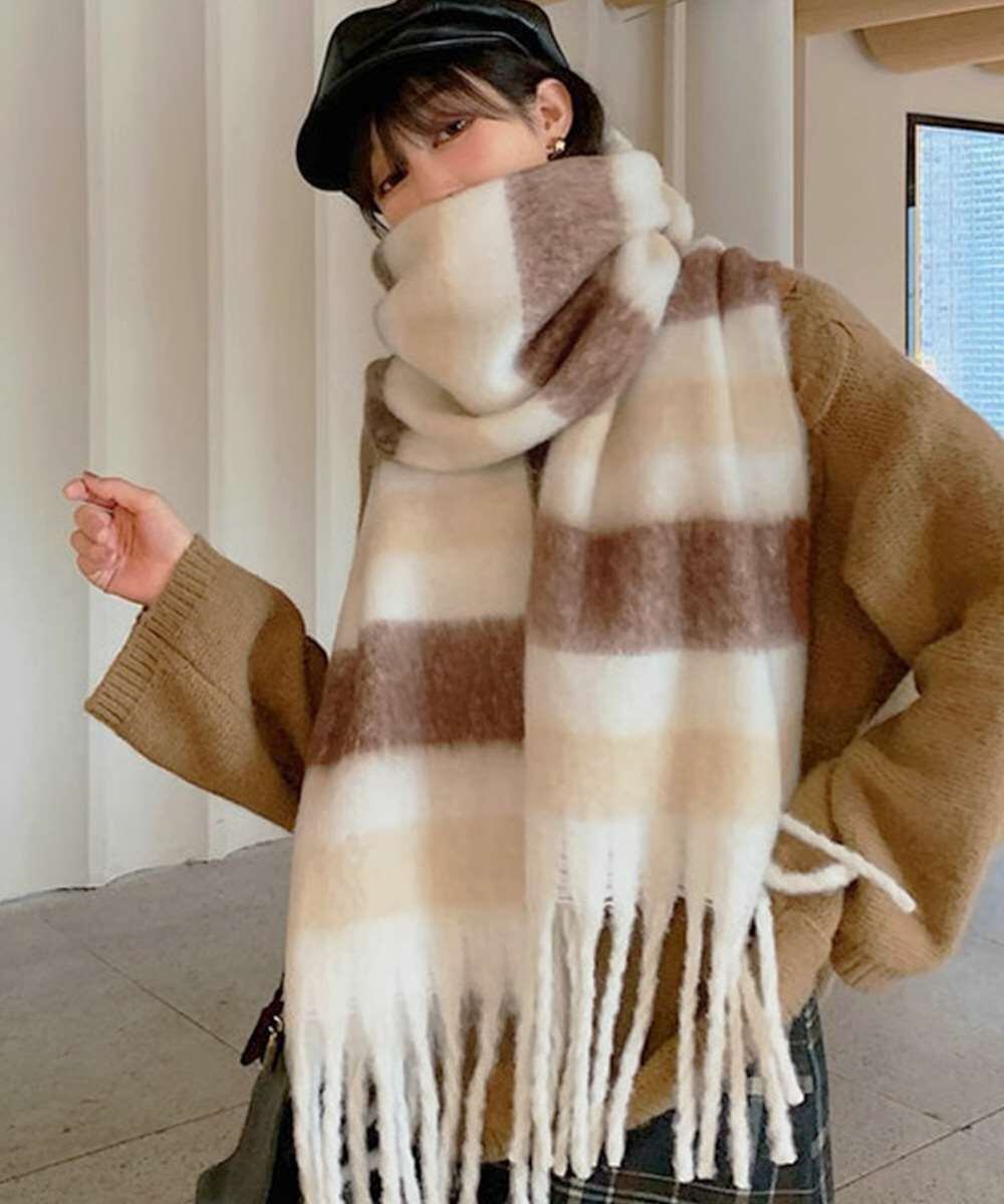 厚手の素材で作られた、ふんわりとした肌触りが心地よい大判マフラー
