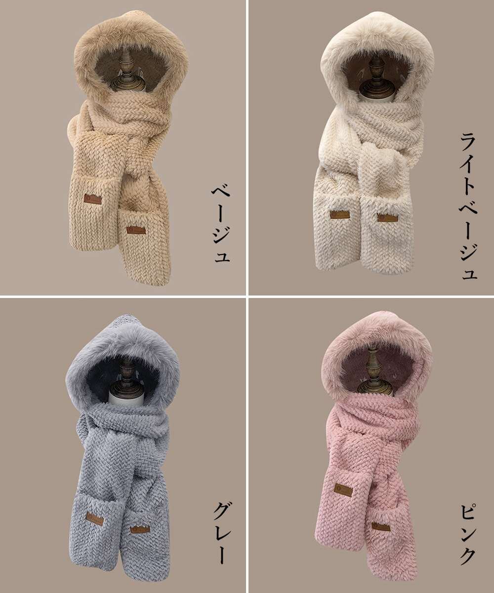 エンボスニット帽子とポケット型手袋が一体化した、キュートで個性あふれるフード付きマフラーです。