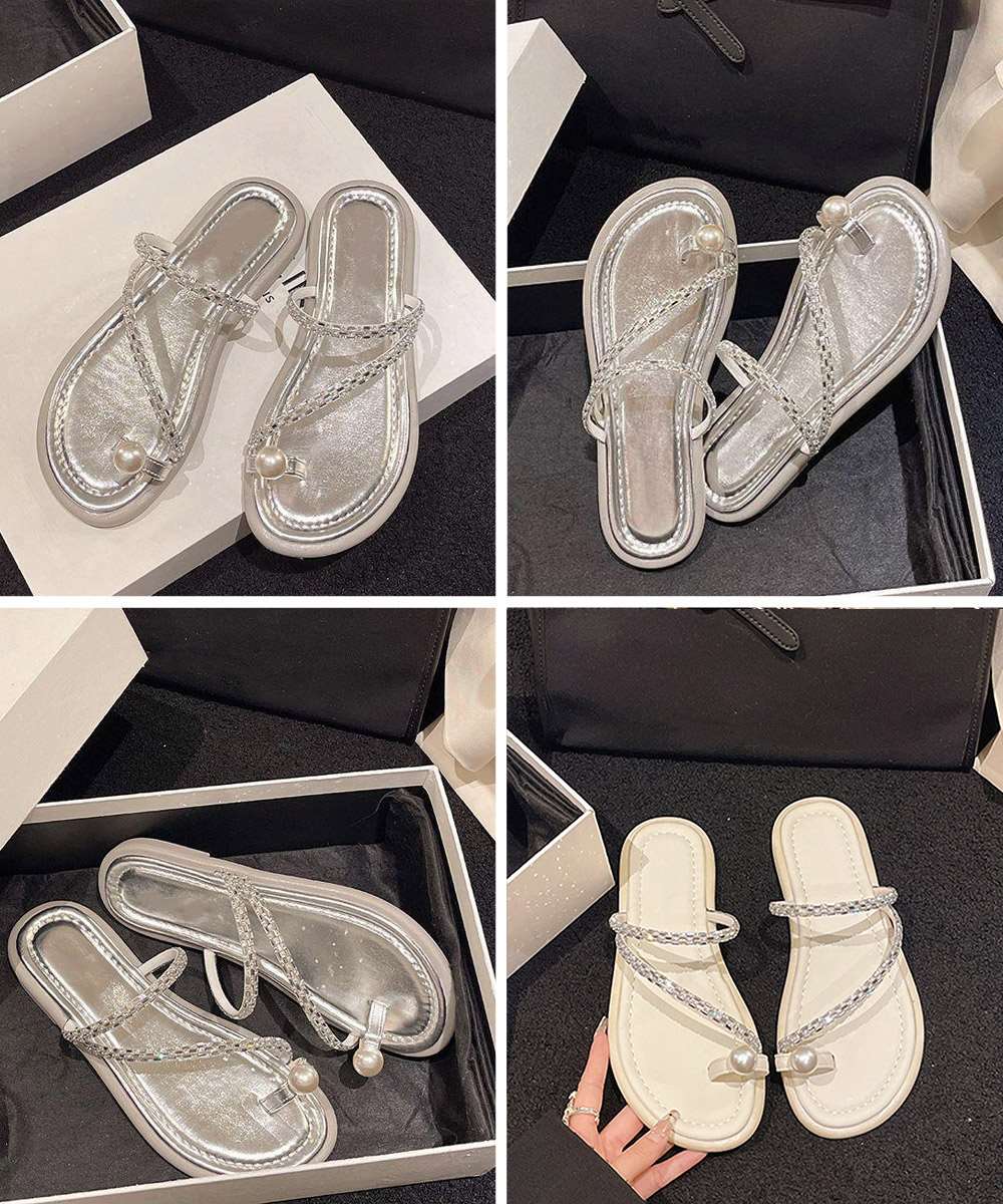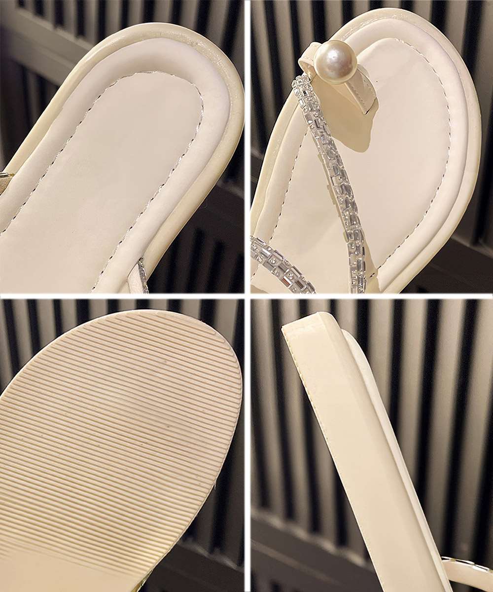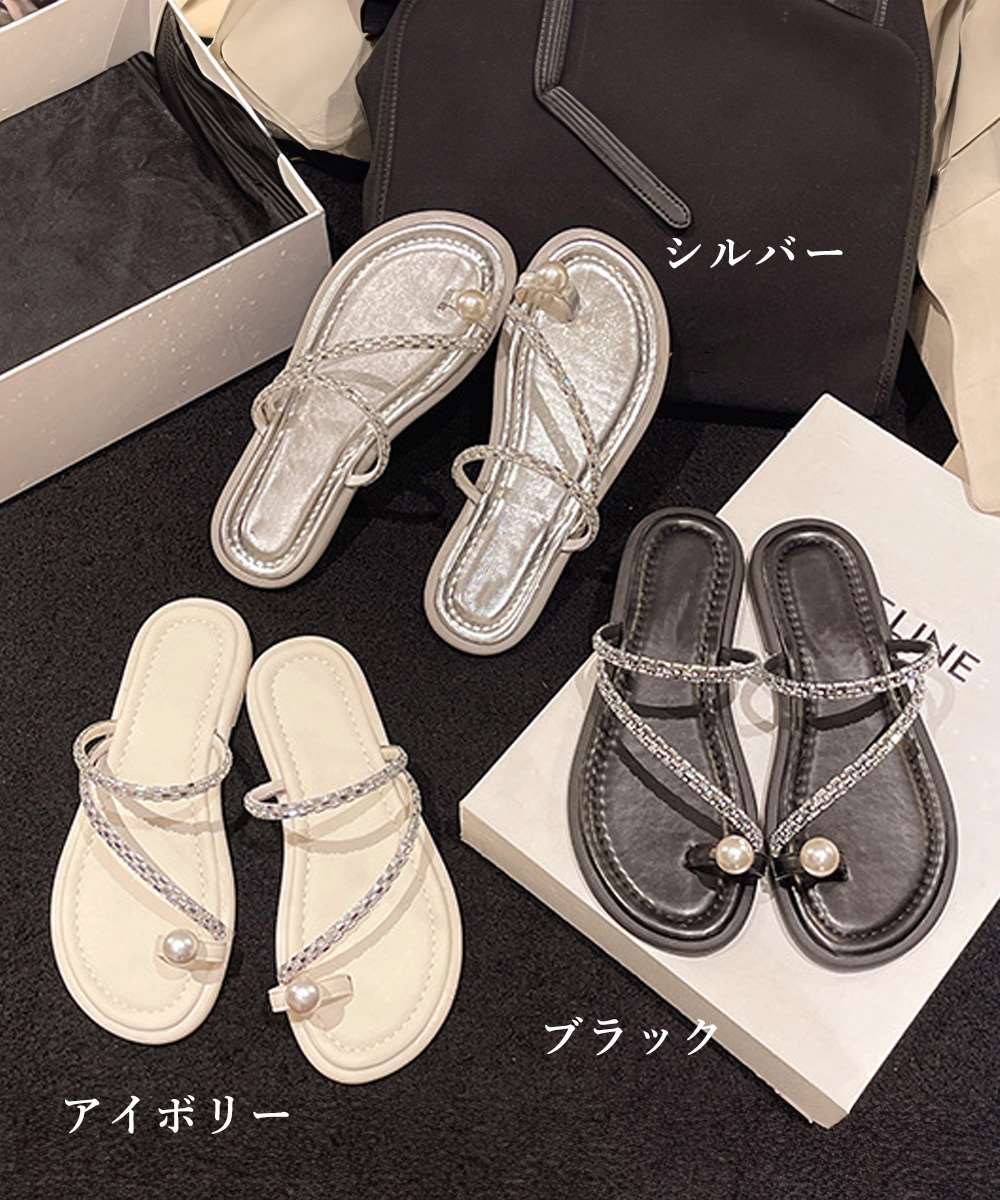 きらきら輝くビジューで飾られた細いストラップが、ヌーディーですっきりとした足元を演出する親指トングサンダル