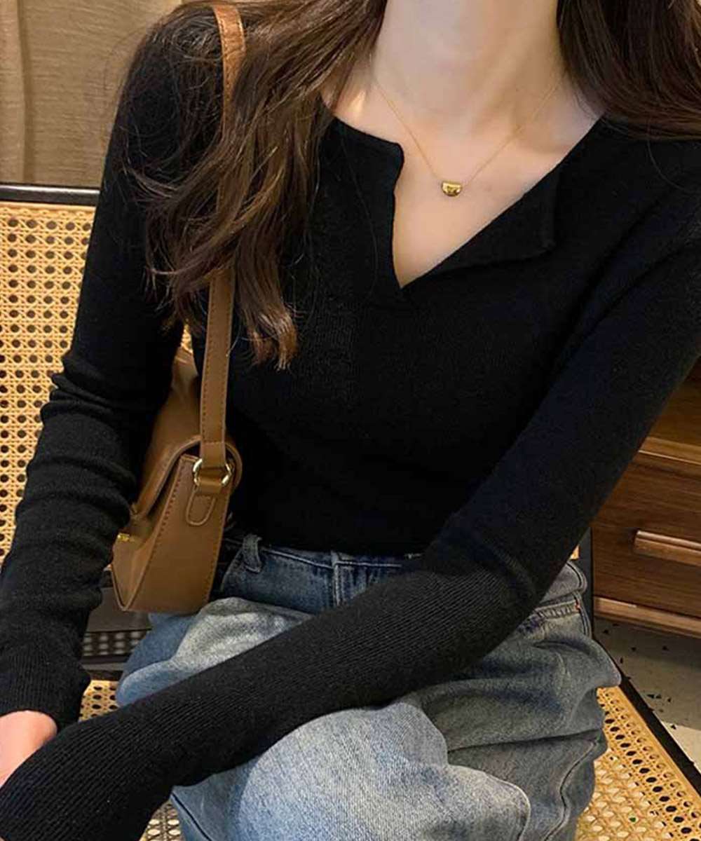 Vネックで首元がすっきり綺麗に見える長袖タイトニットトップス