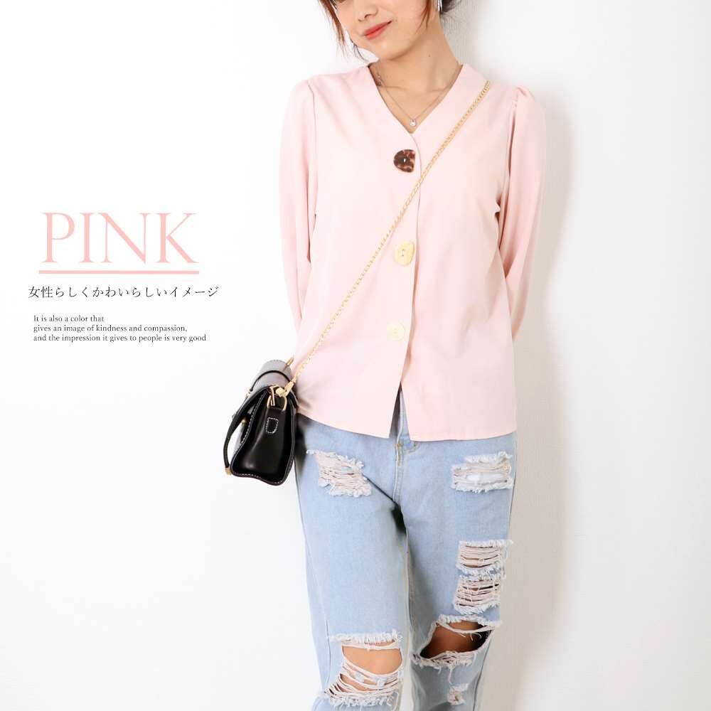 大きなボタンがアクセントになり、上品さが溢れるVネックブラウスです