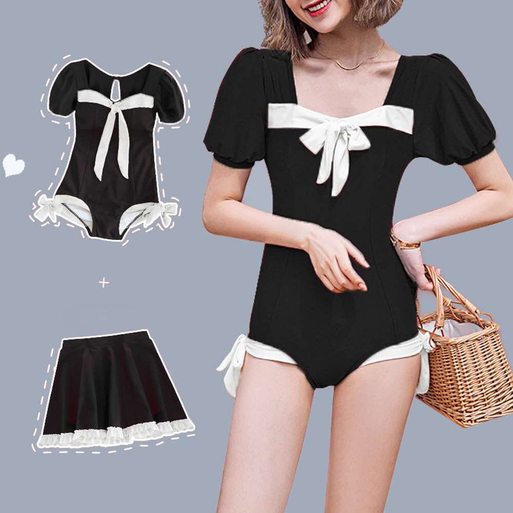 バイカラーのラインとリボンでメリハリを演出し、程よい甘さを醸し出すワンピース水着