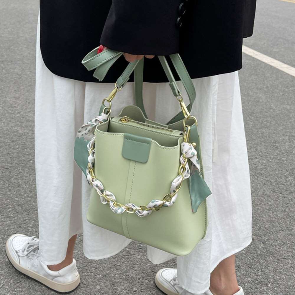 バックの持ち手全体に添わせて巻いているスカーフリボンがおしゃれ感ぐっと増すバケツバッグです