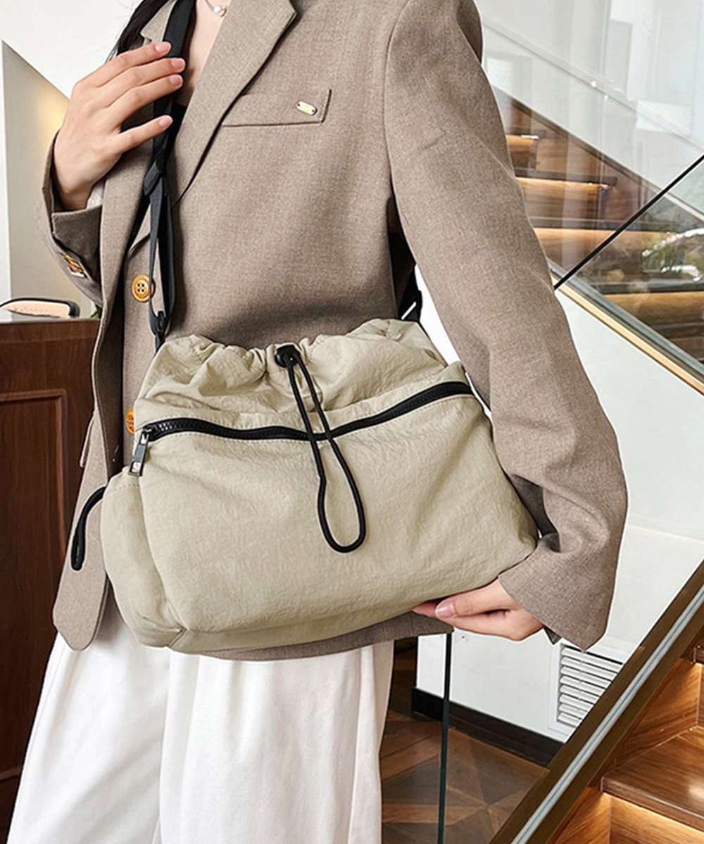 大きすぎず身軽に持てるのに、長財布や折りたたみ傘もしっかり入る、使いやすさ抜群の巾着式ショルダーバッグ