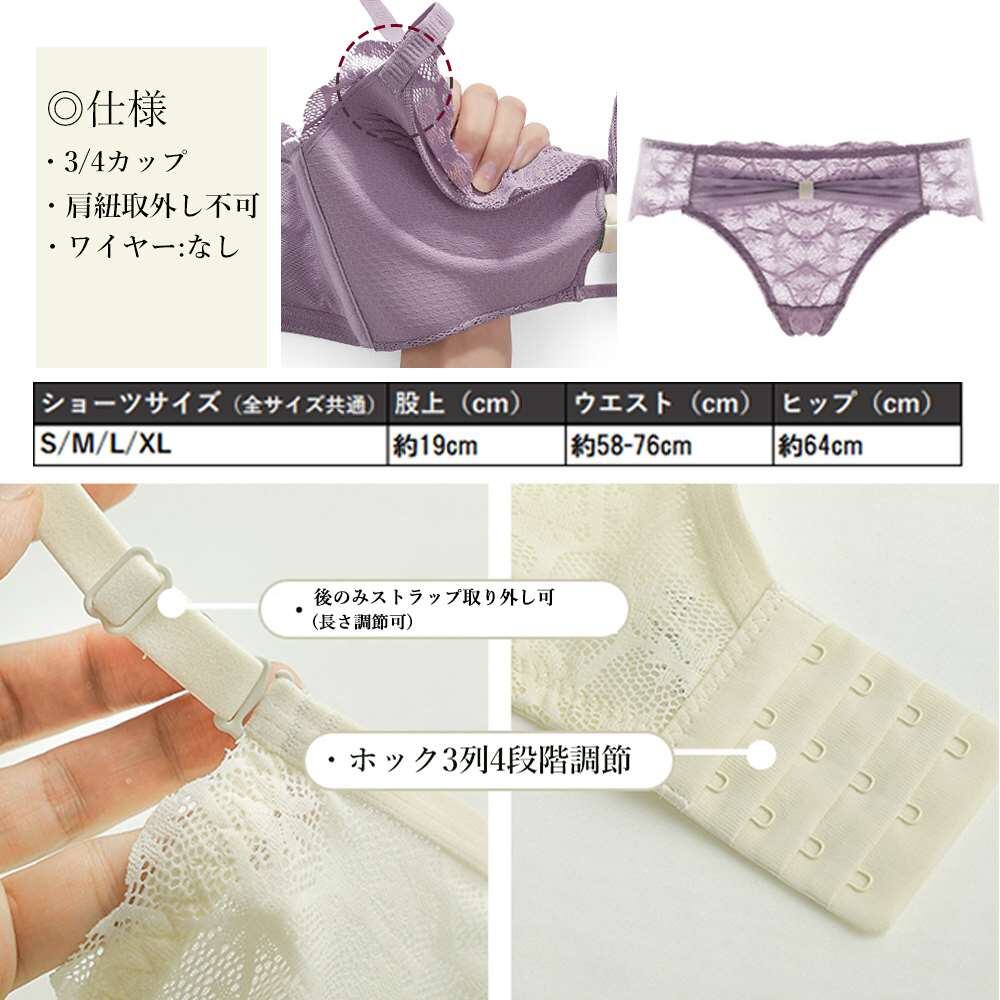 3/4カップ、ホック3列4段階調節、肩紐取外し不可、ワイヤー:なし