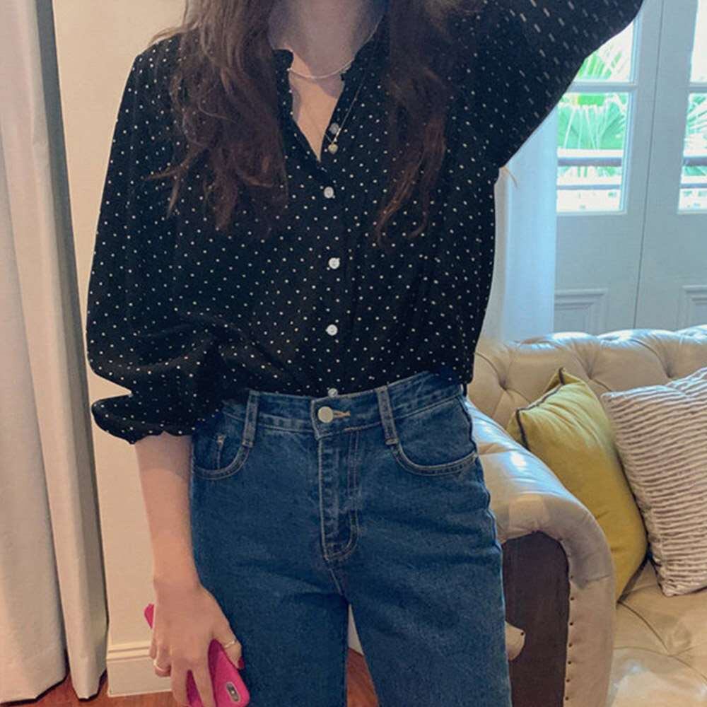女性らしいフェミニンなドット柄ブラウス