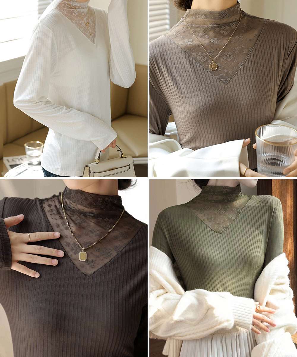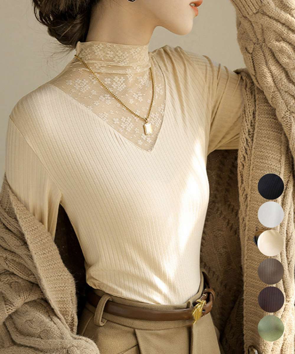 花柄レーストップス レイヤードトップスレディース ストレッチシアー リブトップス シースルー透け薄手肌着 重ね着シャツ