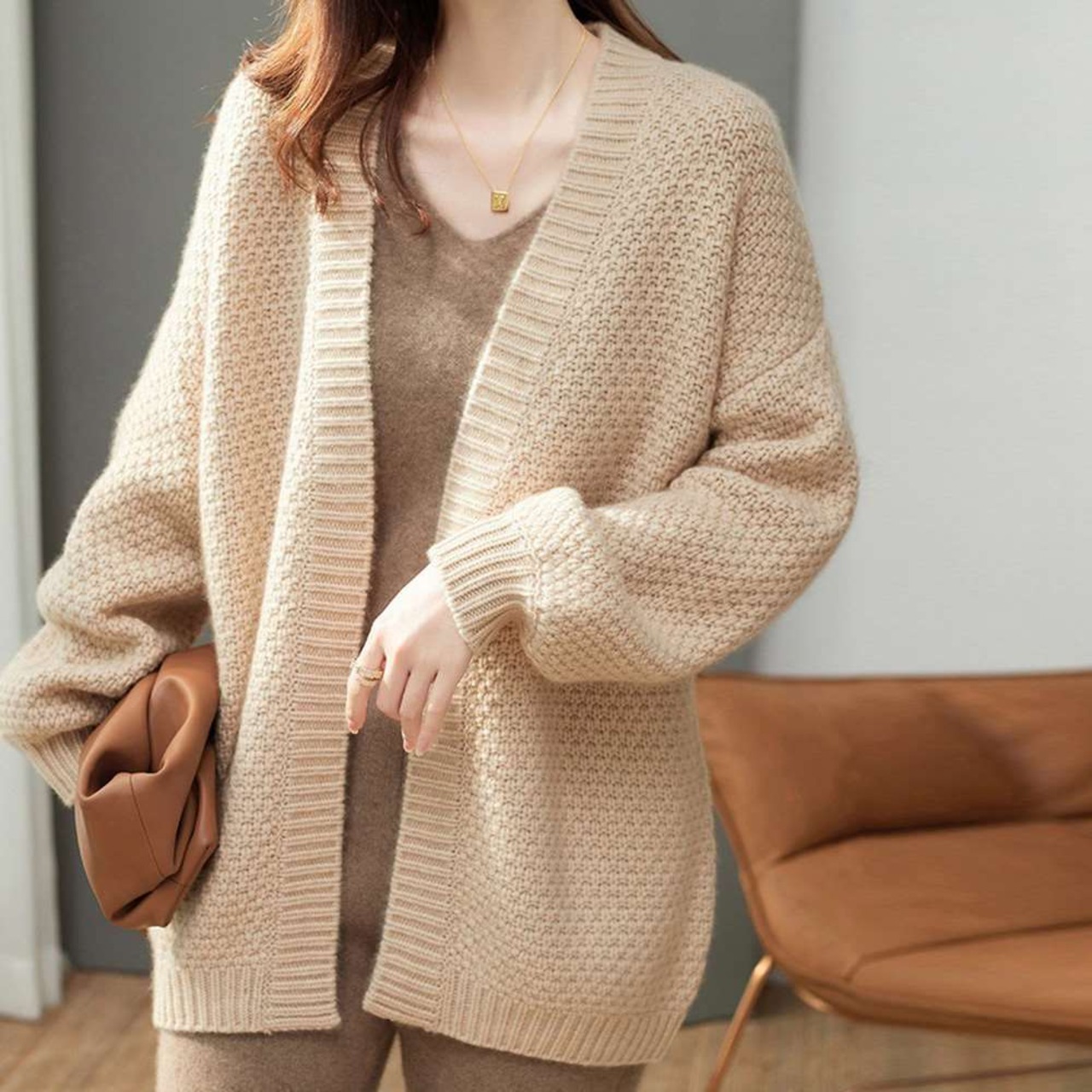 ゆったりとしたサイズ感にノーボタンの仕様でカジュアル感たっぷりのニットカーディガン