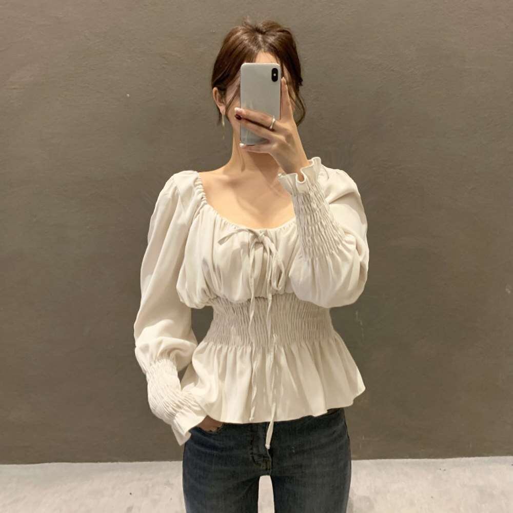 キーワード:スクエアネック無地 ブラウス 上品通勤 ガーリーコーデ韓国