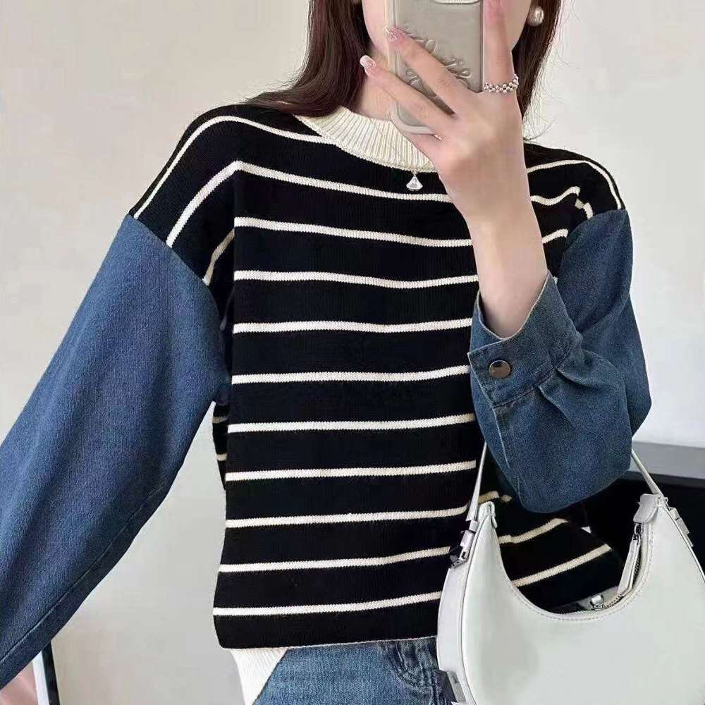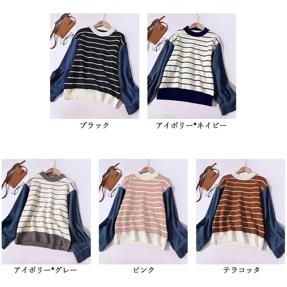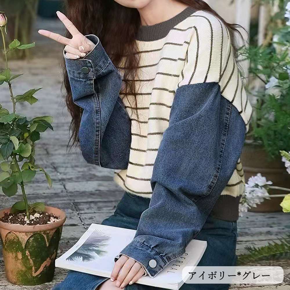 ボーダーニットとデニムシャツを重ね着したようなDESIGN、着膨れせず着やせするレイヤード風トップス