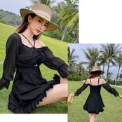 ワンピースデザインで体型をカバーしながら、フェミニンな印象を与えるワンピース水着