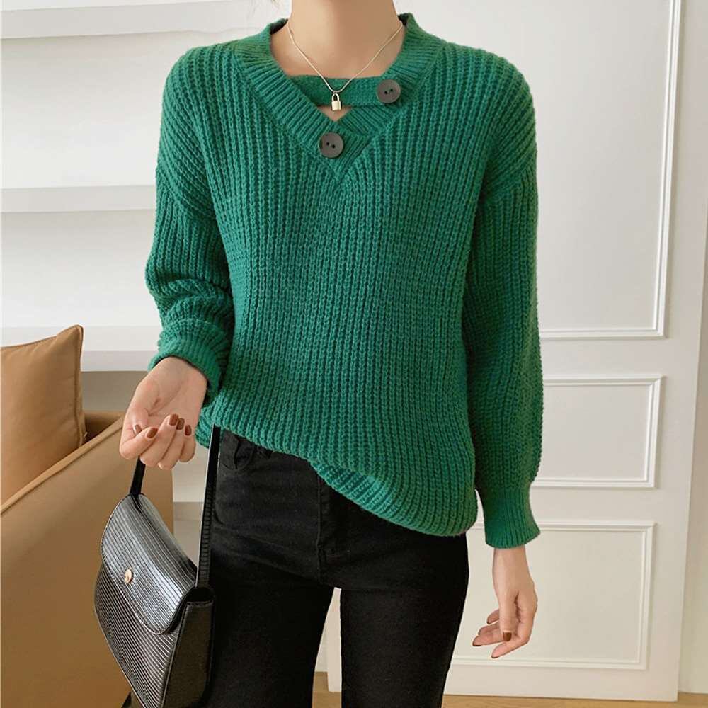 レディース ニットソー Vネック ニットセーター ボタン ざっくりニット ドロップショルダー 韓国ファッション
