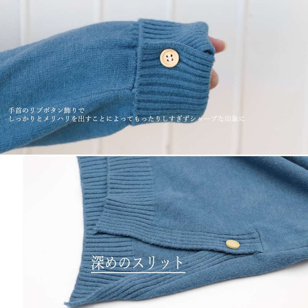 首元のVネック、手首のリブボタン飾りでしっかりとメリハリを出すことによってもったりしすぎずシャープな印象に