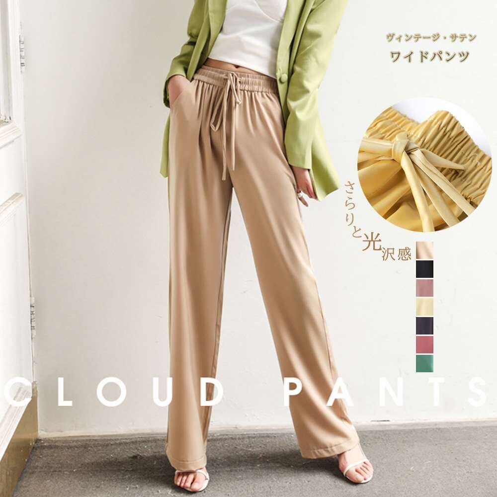 ワイド パンツ レディース ウエストゴム カラーサテン 薄手 ロングパンツ 無地