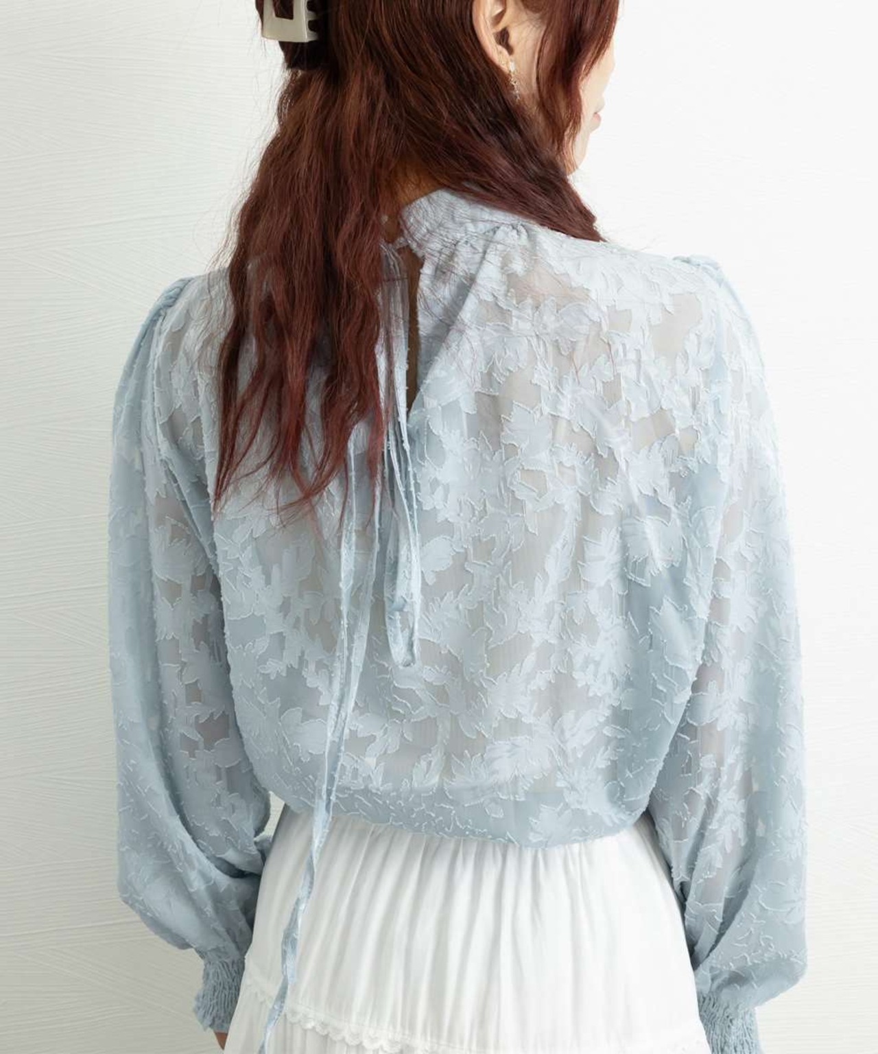 透け感のあるシアー素材とふんわりとしたバルーンスリーブが特徴で、軽やかな着心地と優雅なシルエットを実現