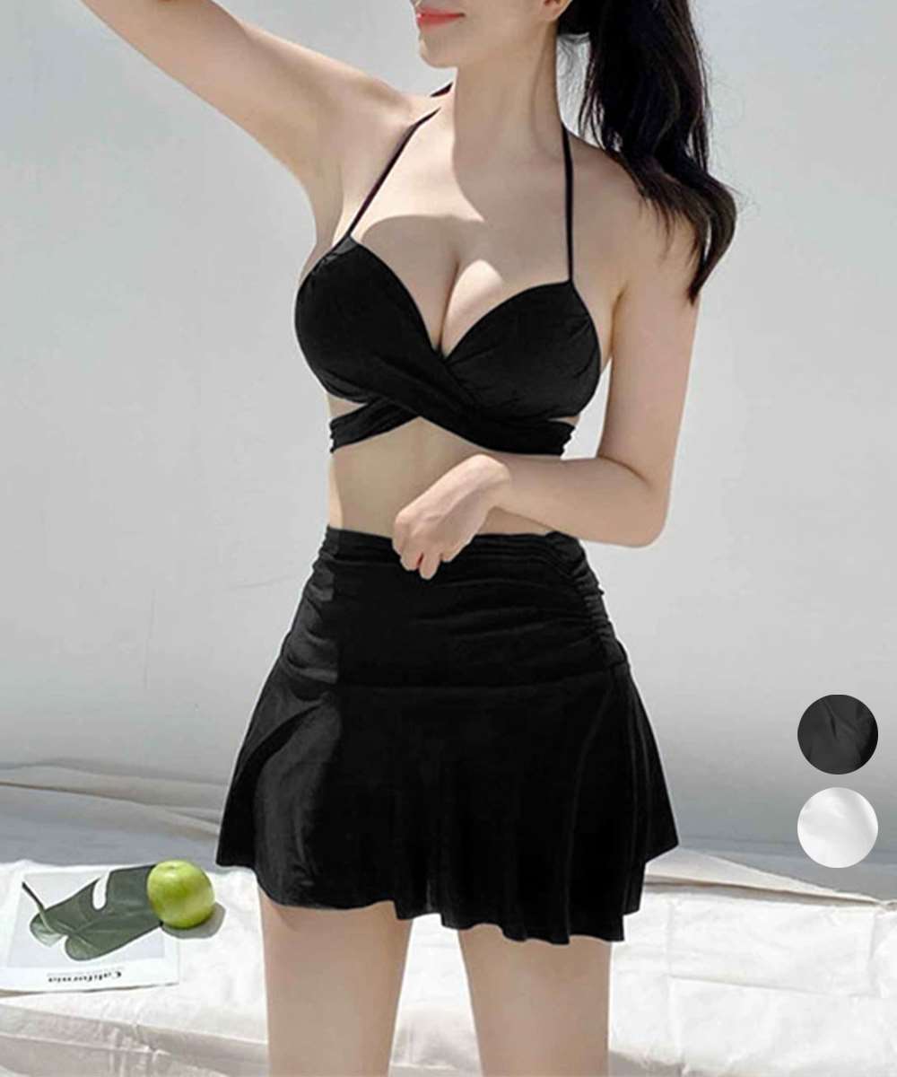 トレンド感あふれるクロスビキニとフレアスカートの3点セット