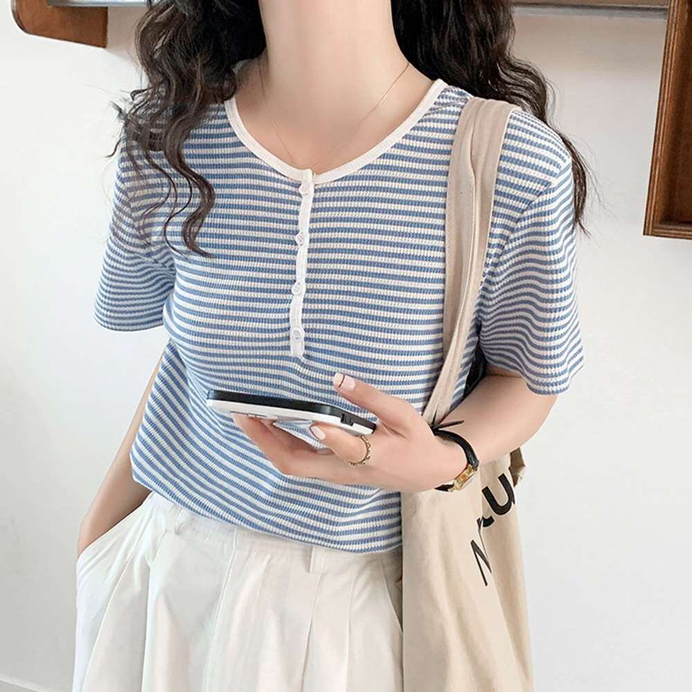 ハーフボタンデザインが爽やかな印象を与え、襟パイピングが上品さを演出する半袖サマーニット