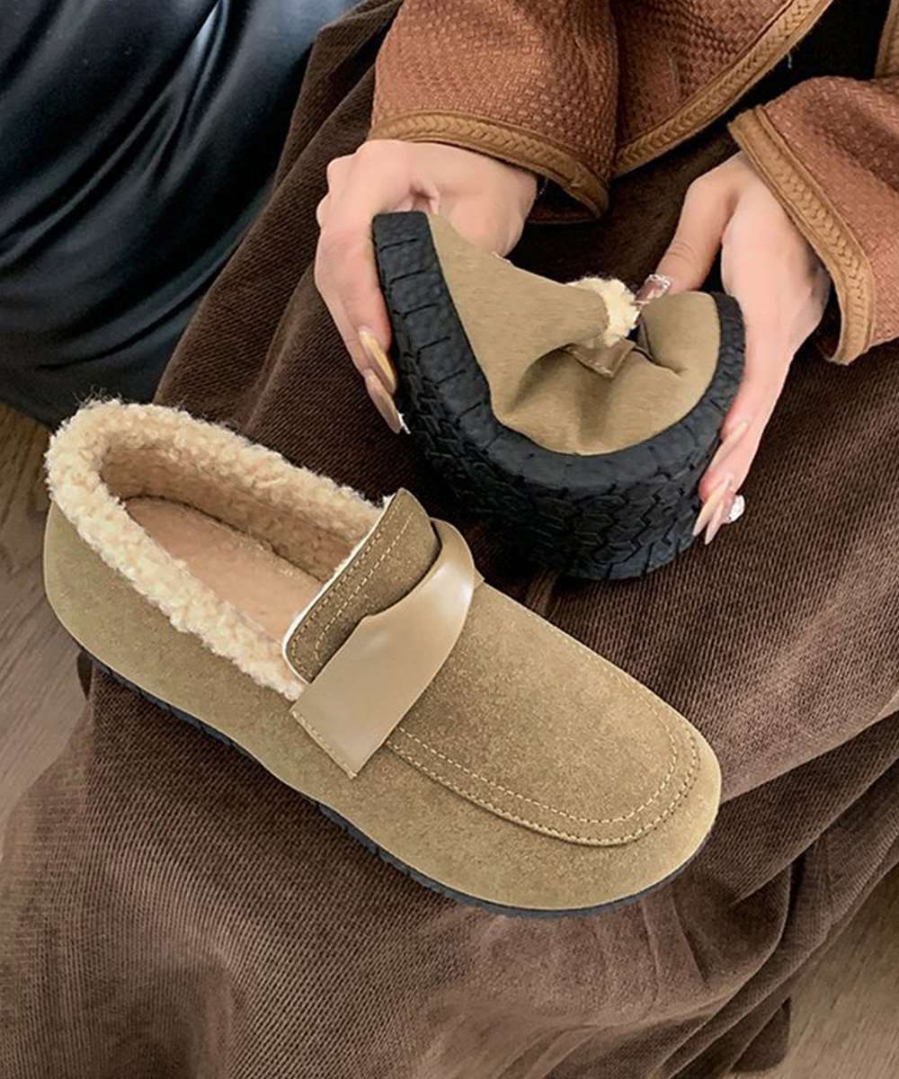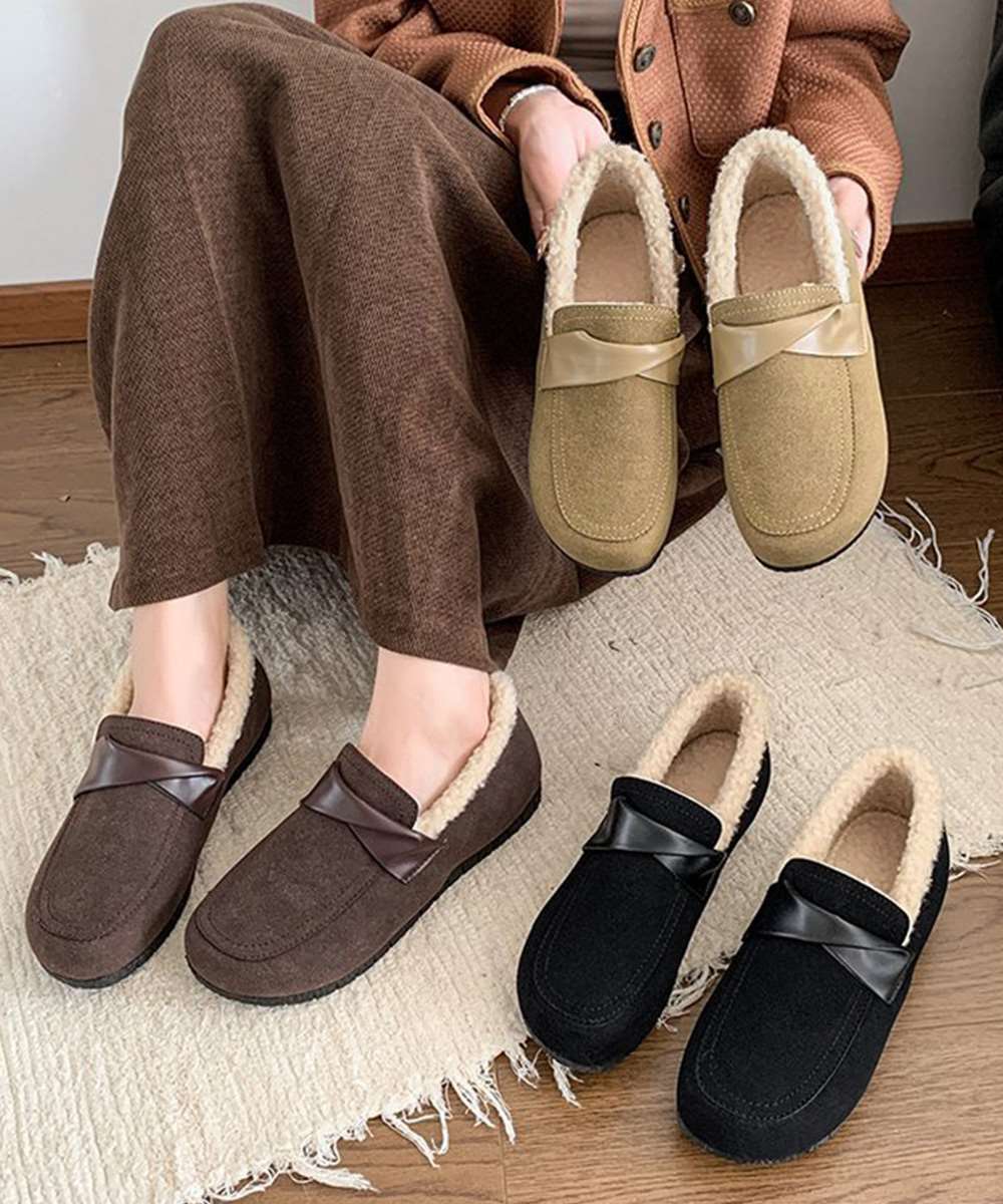 シンプルなデザインで秋冬コーデを軽やかに仕上げるファーモカシン。