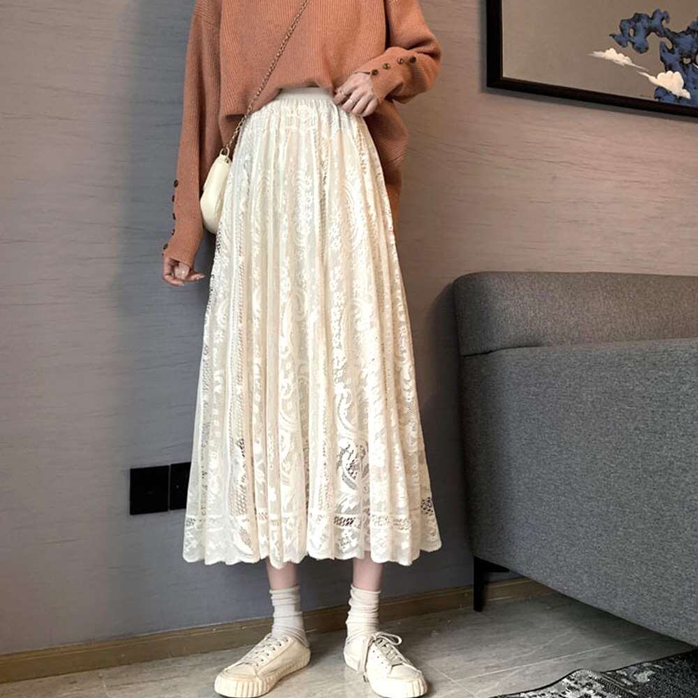 たっぷりとしたボリューム感とフラワーレースが特別感を演出するロングスカート