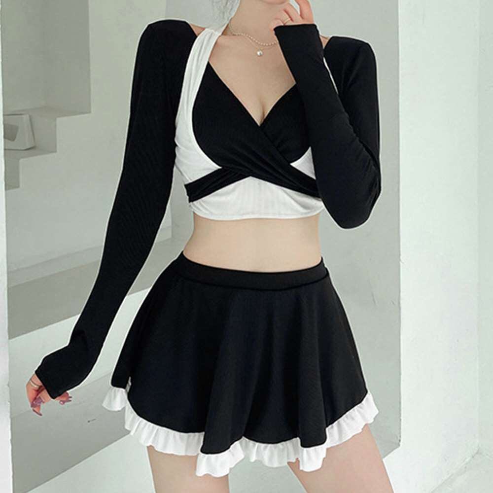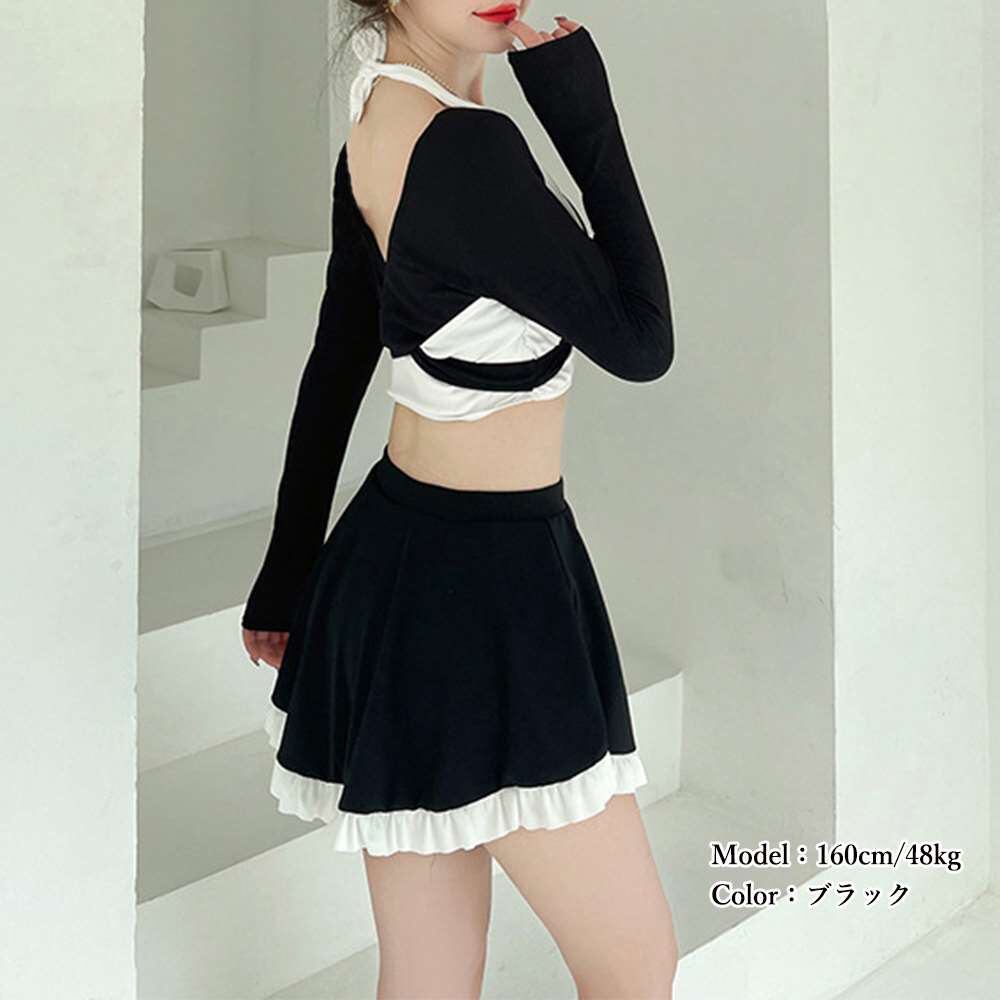 大人かわいいの体型カバー、お洒落に肌チラ見せフリル仕様韓国風タンキニ水着2点セット