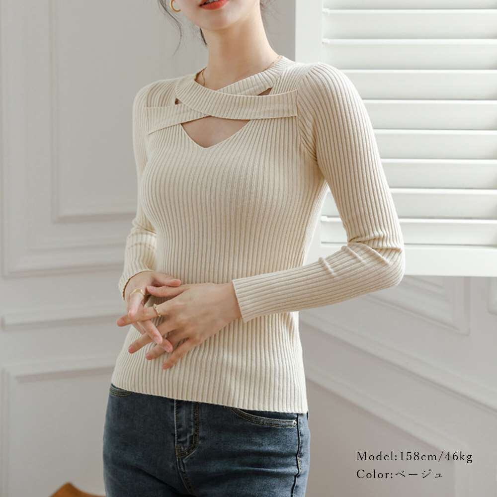 セクシーなフロントクロスと胸開きデザインのニットトップス