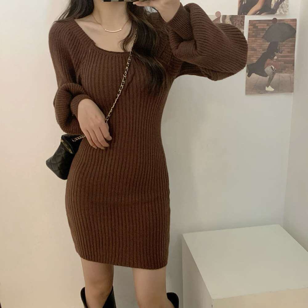 キーワード:インナーワンピ長袖 無地膝上ワンピース 着回しニットワンピ