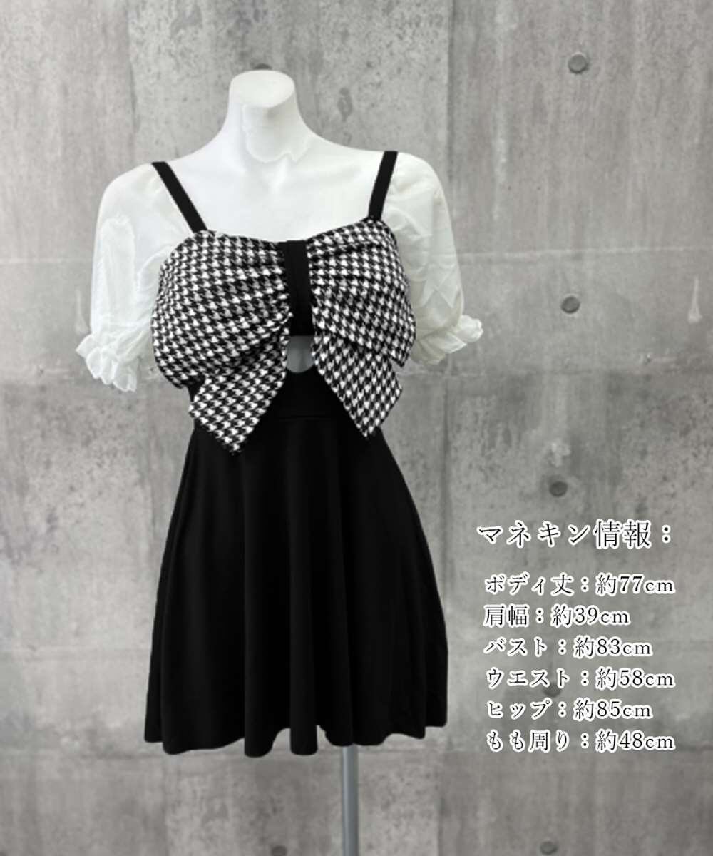 胸元のリボンとフレアに広がるスカートが、大人可愛い雰囲気を演出