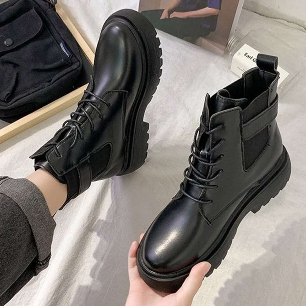 レースアップ ローヒールシューズ 大人カジュアル サイドコアブーツ ベルト付き シューズ ストリートブーティ 疲れない