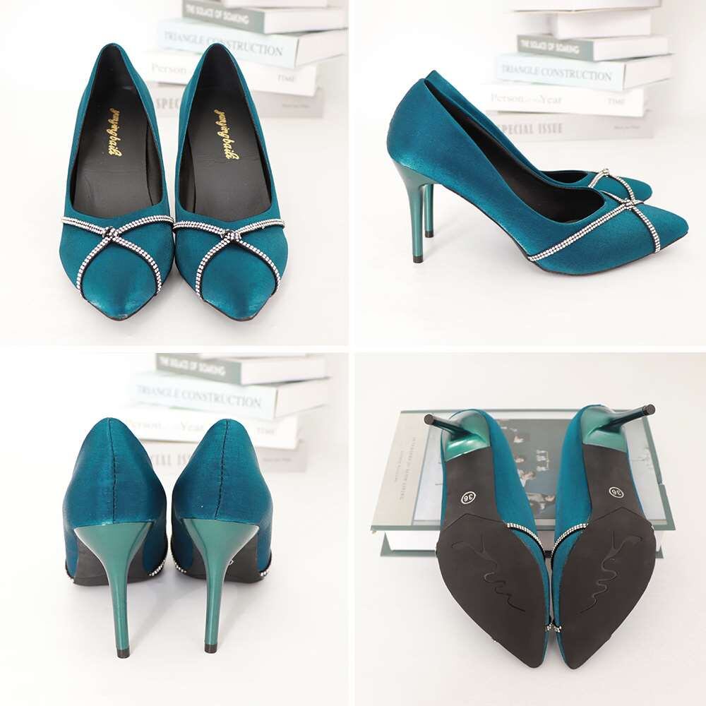 美しいサテン生地を使用してシルキーな光沢感があり、女性らしい雰囲気を演出してくれるハイヒールパンプです