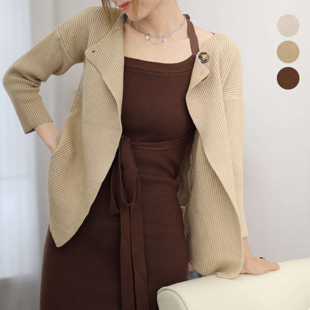 ちくちくせずに肌触りが滑らかなリブ編みニット生地を使用、シンプルに着るだけでヌケ感とキッチリ感をバランス良く演出する7分袖カーディガン
